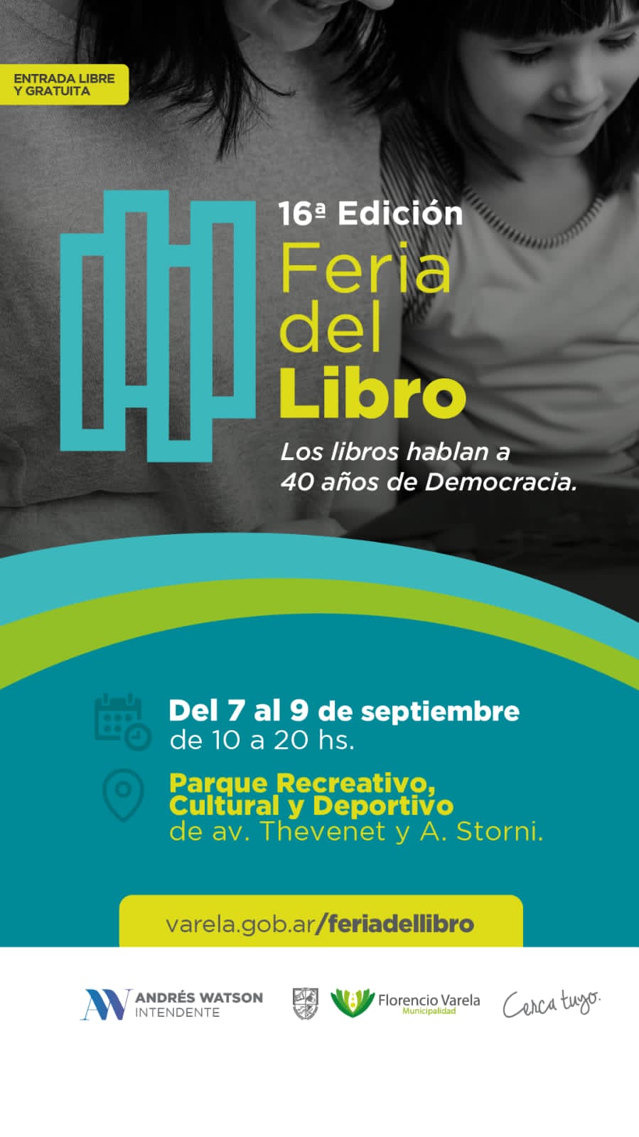Del jueves 7 al sábado 9 de septiembre de 10 a 20hs., se realizará la 16° edición de la Feria del Libro de Florencio Varela, provincia de Buenos Aires, bajo el lema: “los libros hablan a 40 años de democracia”. La misma, tendrá lugar en el Parque Recreativo, Cultural y Deportivo de Av. Thevenet y Alfonsina Storni.