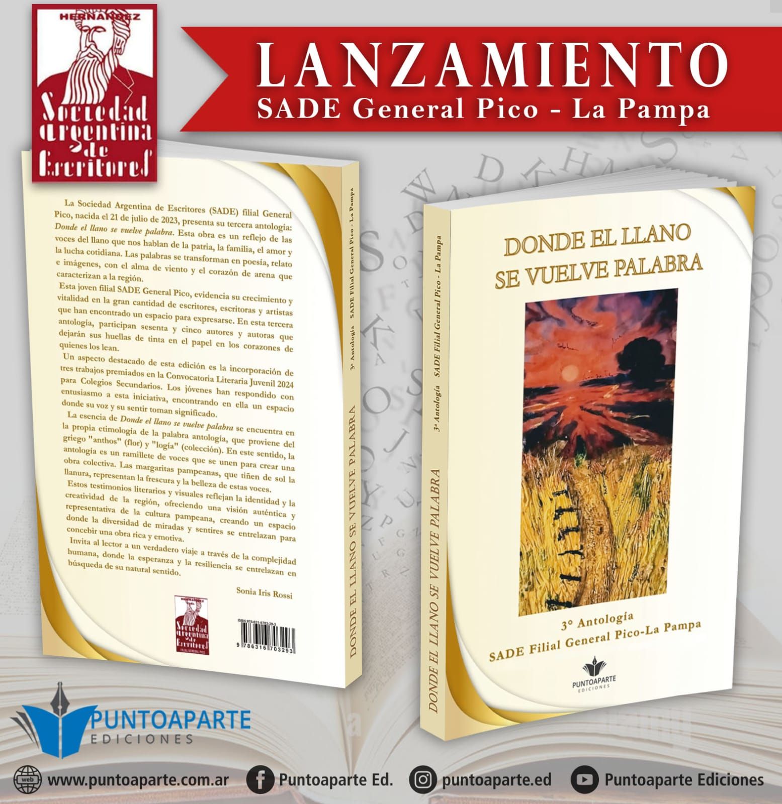 El día 13 de septiembre se presentó en el salón de UTELPA Gral. Pico, la 3ra Antología “Donde el llano se vuelve palabra” (título de la joven escritora María José Cavallo, imagen de la tapa de la escritora y artista plástica, Fabiana Silva), se abrió dicha presentación con las palabras del presidente de la filial, Ariel Dietz, se entregaron certificados a los 68 participantes, hubo invitados especiales como el excombatiente de Malvinas, Alejandro Pellitero y danzas folclóricas a cargo del grupo Peñi Rupun de Santa Rosa L.P. Importante destacar que fueron nombrados: socias honorarias a las escritoras: Celina Galeano y Clementina Rossini y socio honorario a héctor “Pérez” farías por sus trayectorias en las letras. Una verdadera celebración.