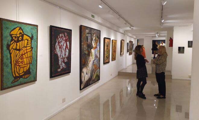 Sumar a los bastidores tradicionales de mayor formato, soportes circulares no es casual. Quizá sea reminiscencia del taller de Roberto Páez al que asistía, donde círculo y energía creativa se asociaban al arte marcial del Tai Chi Chuan y, en ese hilo, haya entretejido en la muestra “Circular” reciente, la integración de formas y modos en su barrio donde 200 obras irradiaron presencia dentro y fuera de espacios de arte, habitando salitas de salud, talleres mecánicos y negocios. La causalidad de series y paleta que retoma para esta muestra lo avecina a Roberto Aizenberg hacia nuevas conversaciones sin tiempo sobre el sentido de la vida y sus ciclos eternos.